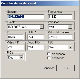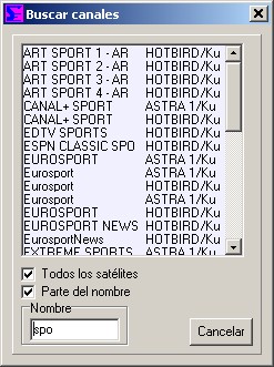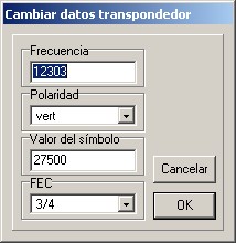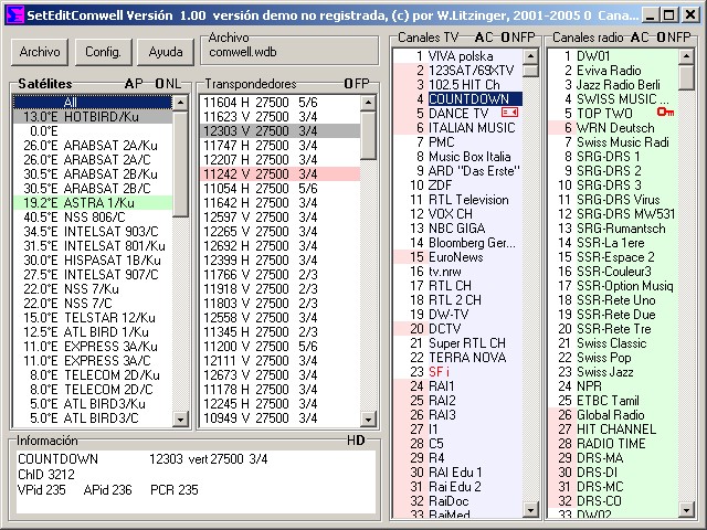 La ventana principal con la lista de satétites, Transpondedores, y los canales.