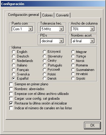 Aquí puede elegir el idioma del menú, configurar los puertos de comunicacóin, elegir si quiere ver/introducer PIDs en decimal o hexadecimal, introducer la tolerancia de frecuencia para la importación, mantener el editor siempre en pantalla o cambiar los colores en la lista de objetos.