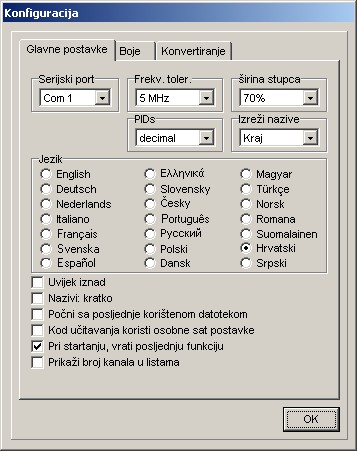 Ovdje možete izabrati izbornik za jezike, namjestiti portove za komuniciranje, izabrati ako želite vidjeti/unijeti u dekadskom ili heksadekadskom obliku, unijeti dozvoljenu frekvenciju za import, čuvati editor uvijek iznad svih ili promijeniti boje stavkama liste.