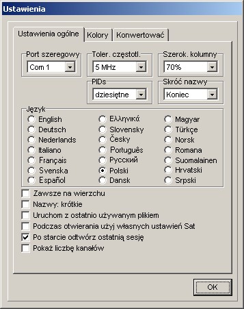 Tutaj możecie wybrać język menu, konfigurację portów, zdecydować czy chcecie widzieć/ wprowadzać PIDs w systemie dziesiętnym, czy szesnastkowym, wprowadzić tolerancję częstotliwości, umieścić okno edytora na wierzchu albo zmienić kolory zaznaczeń na listach.