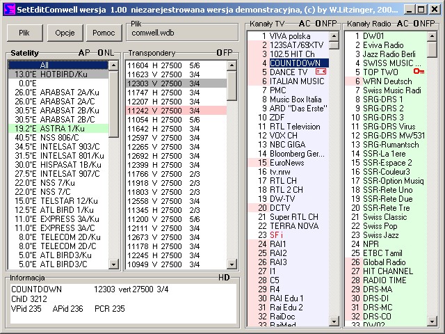Okno główne, tutaj widzimy wszystkie satelity, transpondery, i oczywiście kanały.