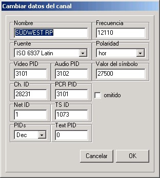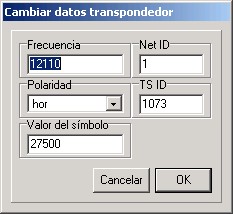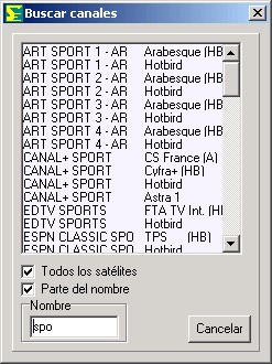 La ventana principal con la lista de satétites, Transpondedores, y los canales.