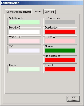 Aquí puede elegir el idioma del menú, configurar los puertos de comunicacóin, elegir si quiere ver/introducer PIDs en decimal o hexadecimal, introducer la tolerancia de frecuencia para la importación, mantener el editor siempre en pantalla o cambiar los colores en la lista de objetos.