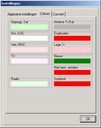 Hier worden de menutaal, de aansluitingen, de PID's en de in de zenderlijst aangeven frequentie tolerantie voor import van andere formaten. Daarnaast kunt u het schrijven veranderen en hier achtergrondkleuren van SetEdit