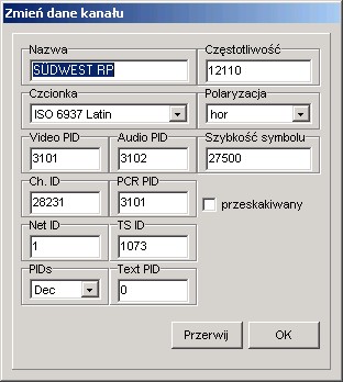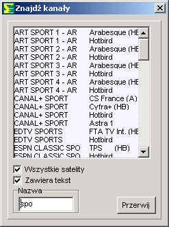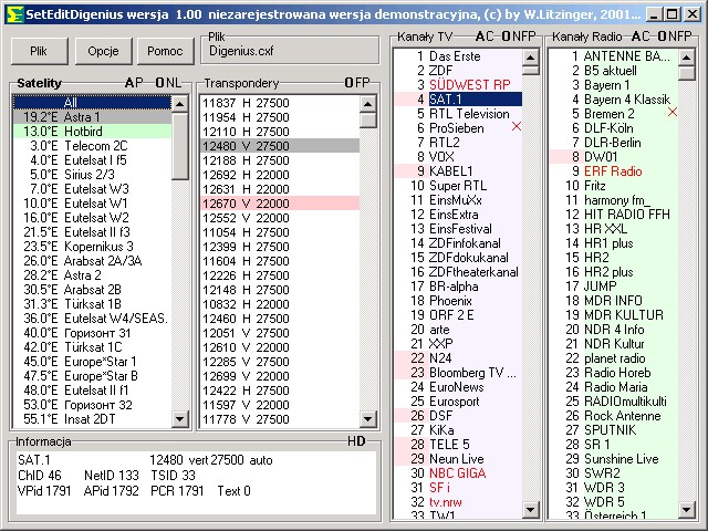 Okno główne, tutaj widzimy wszystkie satelity, transpondery, i oczywiście kanały.