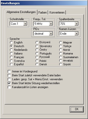 Hier werden die Menüsprache, die Schnittstelle, die Darstellung der PIDs und der Kanalliste eingestellt und eine Frequenztoleranz für den Import von Fremdformaten eingegeben. Außerdem können Sie hier die Schrift- und Hintergrundfarben von SetEdit verändern.