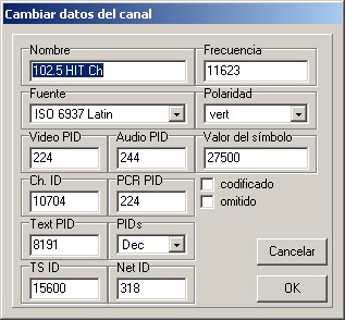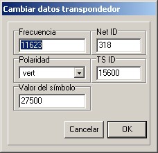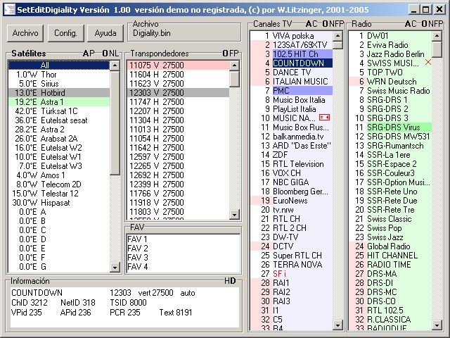 La ventana principal con la lista de satétites, Transpondedores, favoritos, y los canales.