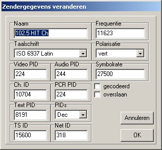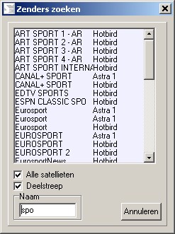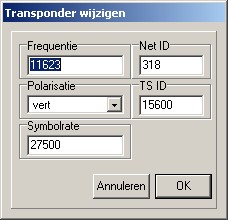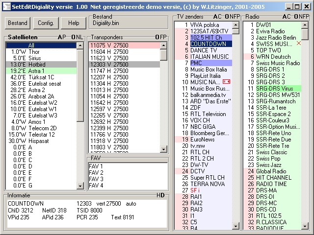 Het hoofdvenster, hier ziet u alle satellieten, transponders, Fav lijst, en natuurlijk de zenders