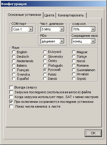 Здесь Вы можете выбрать язык меню, интерфейс, изображение PID, настройки листа каналов, задать допустимое отклонение частоты для импорта неизвестных форматов. Кроме того, вы можете здесь изменить шрифт и фон.