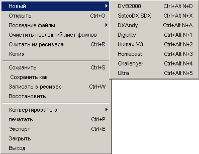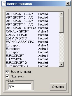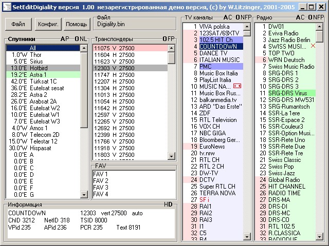Главное окно, здесь Вы видите все спутники, транспондера, FAV, и, конечно каналы
