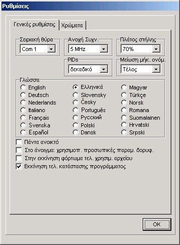 Εδώ μπορείτε να επιλέξετε γλώσσα, τη μορφή των PID (δεκαδική ή δεκαεξαδική) και της λίστας καναλιών, την ανοχή συχνότητας για την εισαγωγή άλλων μορφών(formats), και να ρυθμίσετε τα ports επικοινωνίας. Εξάλλου μπορείτε να αλλάξετε τη γραφή και τα χρώματα φόντου του SetEdit.