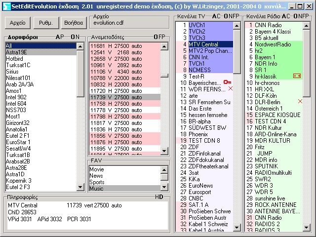 Το κυρίως παράθυρο, εδώ βρίσκονται: δορυφόροι, αναμεταδότες, αγαπημένα, και φυσικά τα κανάλια.