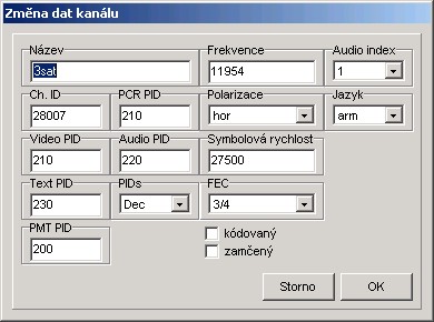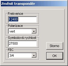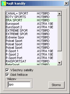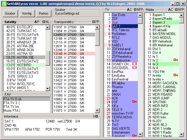 Hlavní okno, zde vidíte všechny satelity, transpondéry, FAV, a samozřejmě kanály