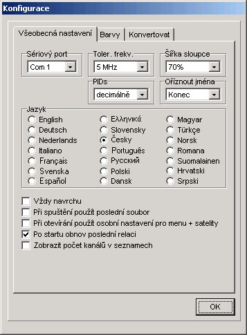 Zde mŭžete změnit jazyk menu, nakonfigurovat komunikační bránu, chcete-li vidět/zadat PIDs v desítkové či šestnáctkové soustavě, zadat frekvenci, toleranci pro import, umístit okno editoru vždy v horní části nebo změnit barvy jednotlivých položek seznamu.