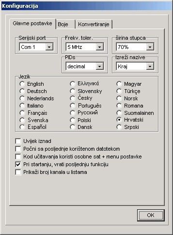 Ovdje možete izabrati izbornik za jezike, namjestiti portove za komuniciranje, izabrati ako želite vidjeti/unijeti u dekadskom ili heksadekadskom obliku, unijeti dozvoljenu frekvenciju za import, čuvati editor uvijek iznad svih ili promijeniti boje stavkama liste.