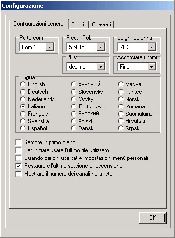Da qui puoi scegliere il linguaggio del menu, configurare le porte di comunicazione, scegliere se preferisci vedere/inserire i PID in decimali o hexadecimali, inserire la tolleranza in frequenza per l'importazione, mantenere sempre l'editore in primo piano o cambiare i colori degli elementi della lista.