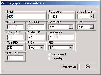 Het hoofdvenster, hier ziet u alle satellieten, transponders, Fav lijst, en natuurlijk de zenders