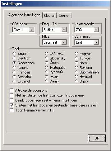 Hier worden de menutaal, de aansluitingen, de PID's en de in de zenderlijst aangeven frequentie tolerantie voor import van andere formaten. Daarnaast kunt u het schrijven veranderen en hier achtergrondkleuren van SetEdit