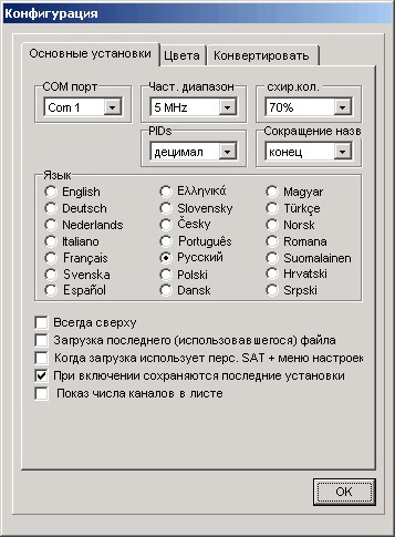 Здесь Вы можете выбрать язык меню, интерфейс, изображение PID, настройки листа каналов, задать допустимое отклонение частоты для импорта неизвестных форматов. Кроме того, вы можете здесь изменить шрифт и фон.