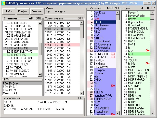 Главное окно, здесь Вы видите все спутники, транспондера, FAV, и, конечно каналы