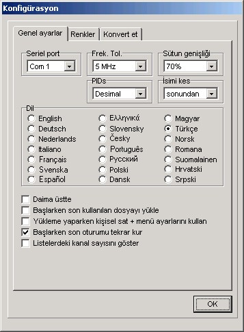Burada menü dili, bağlantı yeri, PID'lerin ve kanal listesinin görüntüsü ayarlanır ve yabancı formatların importu için frekans toleransı verilir. Ayrıca burada SetEdit'in yazı ve ekran renklerini değiştirebilirsiniz.