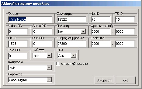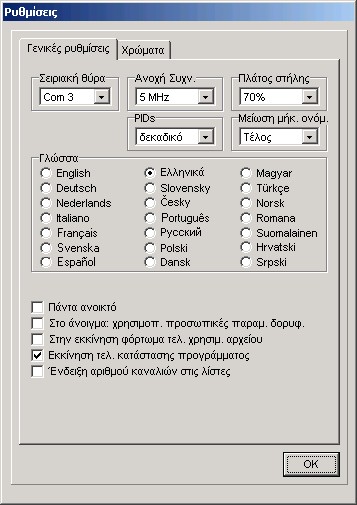 Εδώ μπορείτε να επιλέξετε γλώσσα, τη μορφή των PID (δεκαδική ή δεκαεξαδική) και της λίστας καναλιών, την ανοχή συχνότητας για την εισαγωγή άλλων μορφών(formats), και να ρυθμίσετε τα ports επικοινωνίας. Εξάλλου μπορείτε να αλλάξετε τη γραφή και τα χρώματα φόντου του SetEdit.