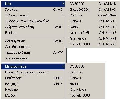 ...μετατροπή από και σε άλλες μορφές ρυθμίσεων (settings formats) ή απευθείας εισαγωγή καναλιών άλλων μορφών στις δικές σας ρυθμίσεις SetEditKoscomPVR. Μπορείτε να επεξεργάζεστε ταυτόχρονα περισσότερες μορφές ρυθμίσεων.