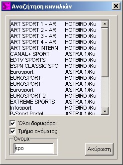Το κυρίως παράθυρο, εδώ βρίσκονται: δορυφόροι, αναμεταδότες, παροχείς, αγαπημένα, και φυσικά τα κανάλια.