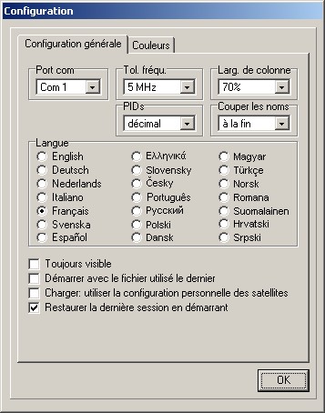Ici vous pouvez choisir la langue du menu, choisir si vous voulez voir/entrer les PIDs en dcimal ou en hexadcimal, entrer la tolrance de la frquence pour l'import, changer les couleurs et entrer les donnes du rseau.