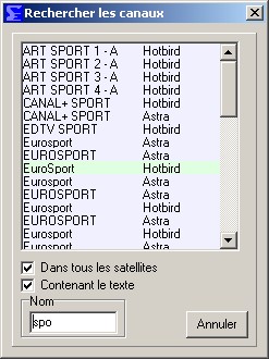 La fentre principale, vous voyez tous les satellites, transpondeurs, FAV, et naturellement les canaux.