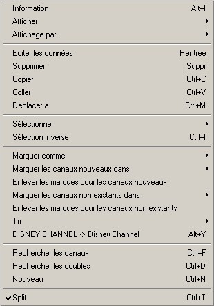 Le menu principal de la liste des canaux.