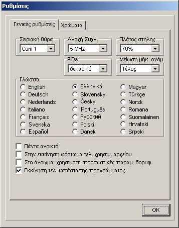 Εδώ μπορείτε να επιλέξετε γλώσσα, τη μορφή των PID (δεκαδική ή δεκαεξαδική) και της λίστας καναλιών, την ανοχή συχνότητας για την εισαγωγή άλλων μορφών(formats), και να ρυθμίσετε τα ports επικοινωνίας. Εξάλλου μπορείτε να αλλάξετε τη γραφή και τα χρώματα φόντου του SetEdit.