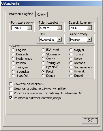 Tutaj możecie wybrać język menu, konfigurację portów, zdecydować czy chcecie widzieć/ wprowadzać PIDs w systemie dziesiętnym, czy szesnastkowym, wprowadzić tolerancję częstotliwości, umieścić okno edytora na wierzchu albo zmienić kolory zaznaczeń na listach.
