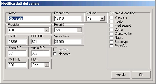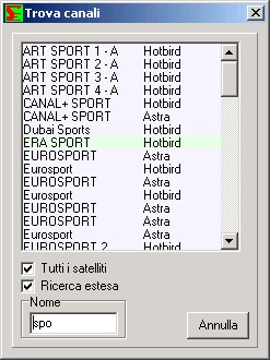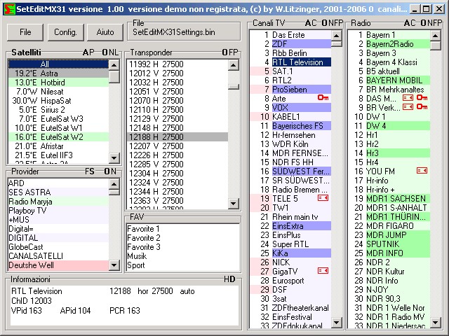 La finestra principale, vedi tutti i satellite, transponder, provider, FAV, e naturalmente i canali.