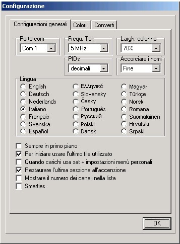 Da qui puoi scegliere il linguaggio del menu, configurare le porte di comunicazione, scegliere se preferisci vedere/inserire i PID in decimali o hexadecimali, inserire la tolleranza in frequenza per l'importazione, mantenere sempre l'editore in primo piano o cambiare i colori degli elementi della lista.