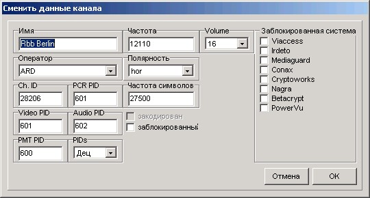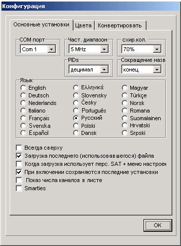 Здесь Вы можете выбрать язык меню, интерфейс, изображение PID, настройки листа каналов, задать допустимое отклонение частоты для импорта неизвестных форматов. Кроме того, вы можете здесь изменить шрифт и фон.