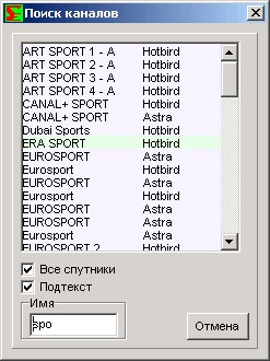 Главное окно, здесь Вы видите все спутники, транспондера, Оператор, FAV, и, конечно каналы