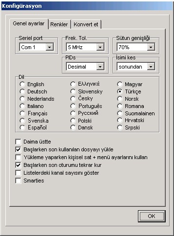 Burada menü dili, bağlantı yeri, PID'lerin ve kanal listesinin görüntüsü ayarlanır ve yabancı formatların importu için frekans toleransı verilir. Ayrıca burada SetEdit'in yazı ve ekran renklerini değiştirebilirsiniz.