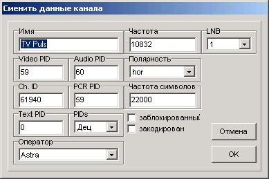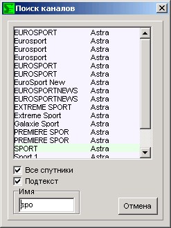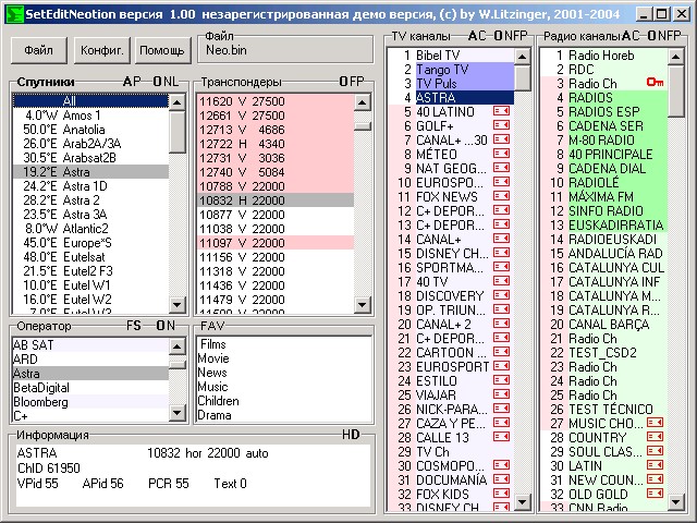 Главное окно, здесь Вы видите все спутники, транспондера, Оператор, FAV, и, конечно каналы