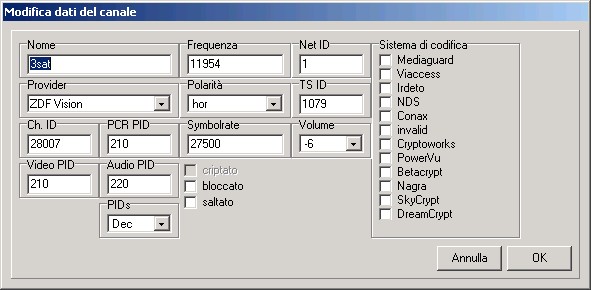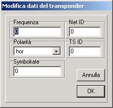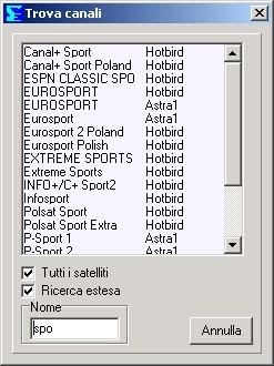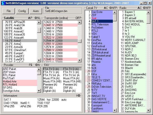 La finestra principale, vedi tutti i satellite, transponder, provider, FAV, e naturalmente i canali.