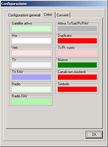 Da qui puoi scegliere il linguaggio del menu, configurare le porte di comunicazione, scegliere se preferisci vedere/inserire i PID in decimali o hexadecimali, inserire la tolleranza in frequenza per l'importazione, mantenere sempre l'editore in primo piano o cambiare i colori degli elementi della lista.