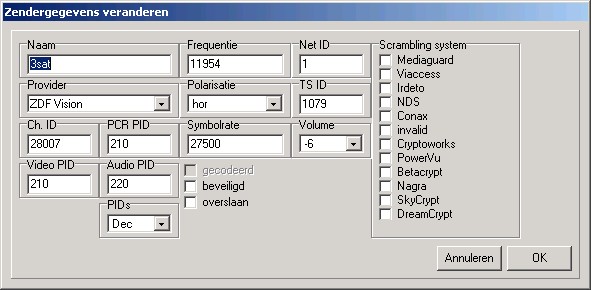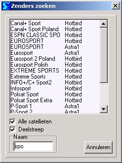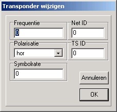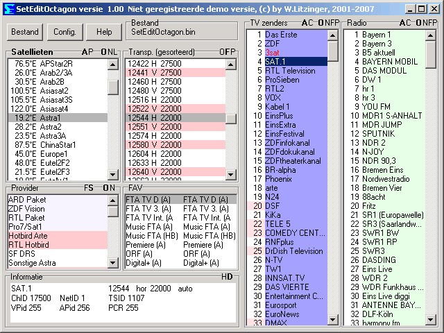 Het hoofdvenster, hier ziet u alle satellieten, transponders, provider, Fav lijst, en natuurlijk de zenders