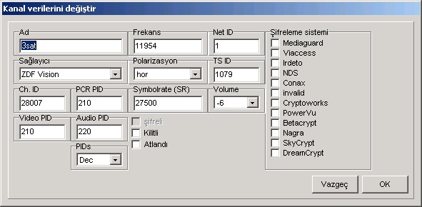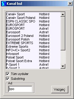 Ana pencere, burada tüm Uydular, Transponderler, Sağlayıcılar, Favoriler, görüyorsunuz ve tabiiki kanalları.
