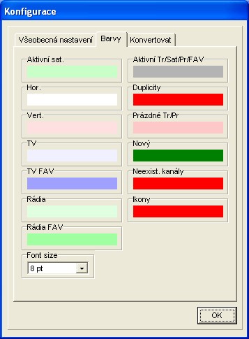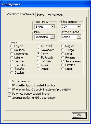 Zde mŭžete změnit jazyk menu, nakonfigurovat komunikační bránu, chcete-li vidět/zadat PIDs v desítkové či šestnáctkové soustavě, zadat frekvenci, toleranci pro import, umístit okno editoru vždy v horní části nebo změnit barvy jednotlivých položek seznamu.