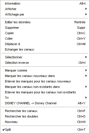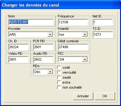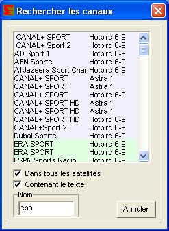 La fentre principale, vous voyez tous les satellites, transpondeurs, FAV, et naturellement les canaux.