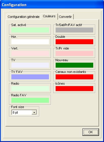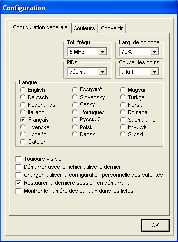 Ici vous pouvez choisir la langue du menu, choisir si vous voulez voir/entrer les PIDs en dcimal ou en hexadcimal, entrer la tolrance de la frquence pour l'import, changer les couleurs et entrer les donnes du rseau.