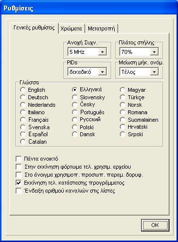 Εδώ μπορείτε να επιλέξετε γλώσσα, τη μορφή των PID (δεκαδική ή δεκαεξαδική) και της λίστας καναλιών, την ανοχή συχνότητας για την εισαγωγή άλλων μορφών(formats), και να ρυθμίσετε τα ports επικοινωνίας. Εξάλλου μπορείτε να αλλάξετε τη γραφή και τα χρώματα φόντου του SetEdit.