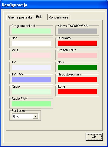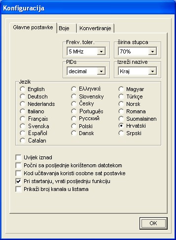 Ovdje možete izabrati izbornik za jezike, namjestiti portove za komuniciranje, izabrati ako želite vidjeti/unijeti u dekadskom ili heksadekadskom obliku, unijeti dozvoljenu frekvenciju za import, čuvati editor uvijek iznad svih ili promijeniti boje stavkama liste.