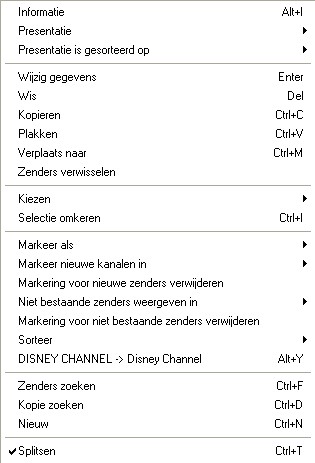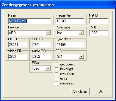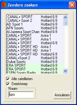 Het hoofdvenster, hier ziet u alle satellieten, transponders, Fav lijst, en natuurlijk de zenders