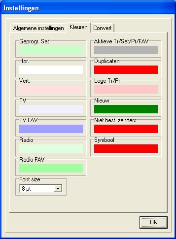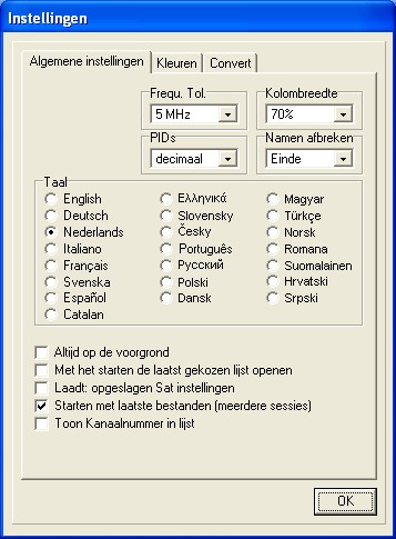 Hier worden de menutaal, de aansluitingen, de PID's en de in de zenderlijst aangeven frequentie tolerantie voor import van andere formaten. Daarnaast kunt u het schrijven veranderen en hier achtergrondkleuren van SetEdit
